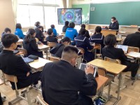 3年1組の理科では、期末テストの直しを行ったあと、恐竜時代から現代までの生命の流れについてビデオで学習していました。3年2組の社会では、生産活動について学び、さまざまな企業の広告を見比べながら特徴や工...