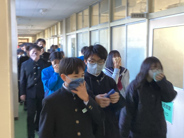 6時間目火災避難訓練を行いました避難後、人員確認のあり方や、スマホ等で身近になったリチウムイオン電池の危険、校外で火災にあった場合の命の守り方について話がありました。