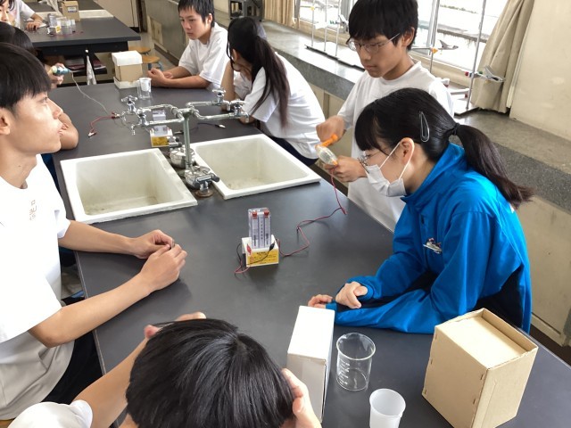 化学変化とイオンの単元の最後に、燃料電池の仕組みを体験しました。燃料電池の仕組みをイオンと関係づけて説明できたら完璧です。