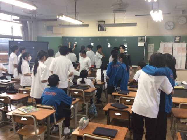 6時間目は、秋華祭体育の部に向けて、赤団・青団・黄団に分かれて団ミーティングを行いました。団長・副団長の自己紹介のあと、各種目に分かれて走順や作戦を話し合いました。縦割り種目は「ハリケーン」「色別対抗...
