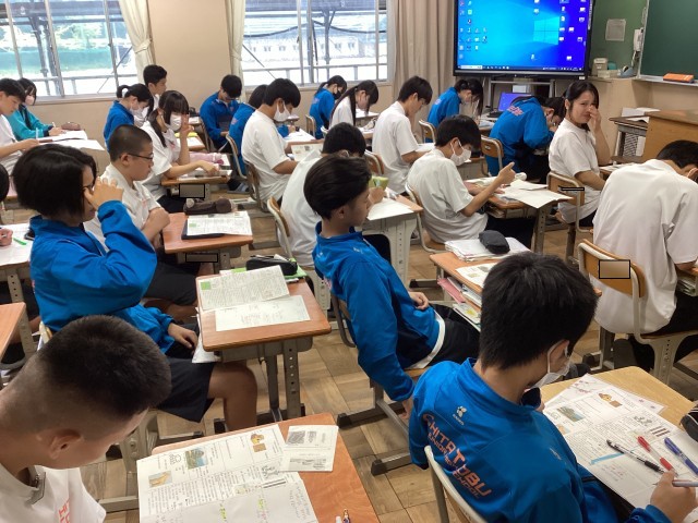 3年1組の社会では、静かに自習に取り組み、歴史に関するマトリックス図を自分なりに整理してまとめていました。3年2組の国語では、ロイロノートの共同編集機能を活用し、グループで協力しながら論説文の要旨をま...