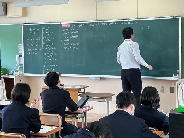 2年4組の数学では、多項式の加法・減法について学習していました。 計算の手順を確認する場面では、適宜「相談タイム」を設け、自分の考えを友達と共有したり、解き方を確認し合ったりする姿が見られました。また...