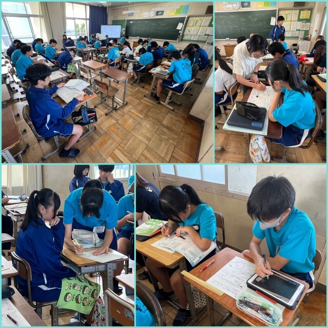 【10/2 ありがとう】 公開日 2025/10/02 更新日 2025/10/02 3年生 3年生の数学科の授業。相似な図形の性質を利用して相似比を求めたり、相似比から図形の辺の長さを求めたりしています。相似比の求め方を確認した後で、練習問題に取り組みます。担当教員や友達に質問している生徒もいます。「そういうことね。ありがとう」友達同士でこんな言葉が自然に出ています。