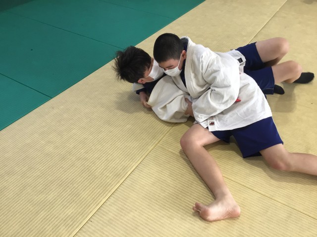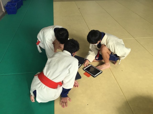 寝技の練習をしていました。動画を撮って改善点を見つけてグループで話し合っていました。