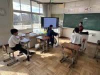 【12/8 ジェスチャーを見て】 公開日 2025/12/08 更新日 2025/12/08 学校の様子 10・11・12・13・14組の英語科の授業。ALTの先生と一緒に学習しています。ALTの先生や代表生徒がジェスチャーしている動きを英語で発表します。電子黒板に映した絵を参考にして、積極的に答えています。