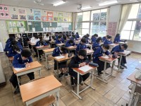 【12/11 道案内をしよう】 公開日 2025/12/11 更新日 2025/12/11 1年生 1年生の英語科の授業。スピーキングテストをしています。サイコロを振って、出た目の数字で道案内する場所が決まります。ALTの先生の質問に、緊張しながらもしっかりと答えています。