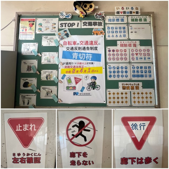 また、廊下には「止まれ」や「徐行」の交通標識などを掲示し、安全な歩行を呼びかけています。