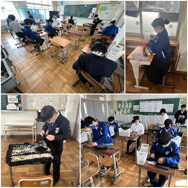 10・11・12・13・14組の生徒が座布団を製作しています。