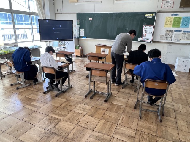 【2/4 集中】 公開日 2026/02/04 更新日 2026/02/04 学校の様子 10組の国語科の授業。文章を読んで、問題に答えています。みんな集中して文章を読んでいます。担当教員は一人一人にアドバイスをしています。