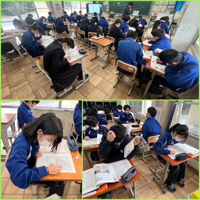 【2/24 地形図を読み取ろう】 公開日 2026/02/24 更新日 2026/02/24 1年生 1年生の社会科の授業。地形図の見方について学習しています。地形図に示される地図記号の意味をプリントにまとめます。その後、八幡中学校付近の地形図を見て、八幡中学校の位置を説明します。「八幡中学校は、つつじが丘小学校の北に位置しています」「八幡中学校は、知多翔洋高等学校の北西に位置しています」地形図を読み取ることができました。