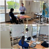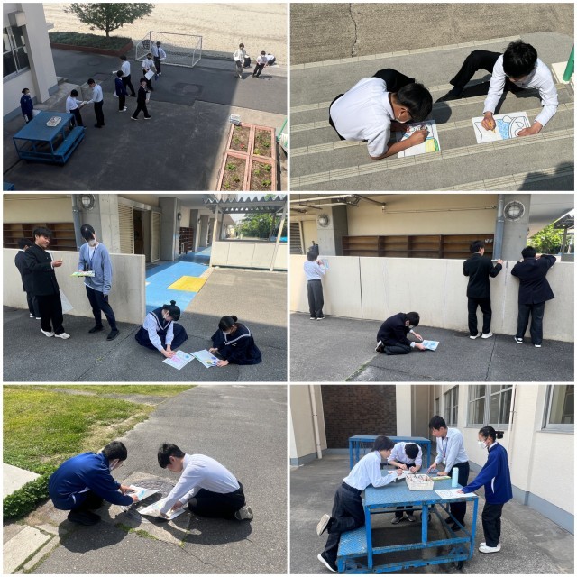 【4/28 浮き上がる模様】 公開日 2026/04/28 更新日 2026/04/28 学校の様子 10・11・12・13・14・15組の美術科の授業。フロッタージュという技法を使って、こいのぼりに着色しています。凹凸のある物の上にこいのぼりの輪郭が描かれた紙を置き、クレパスなどでこすって模様を写し出します。アスファルト、マンホール、壁、朝礼台、扉などにある凹凸を利用しています。こいのぼりのウロコに模様が写し出されます。オリジナルこいのぼりの完成です。