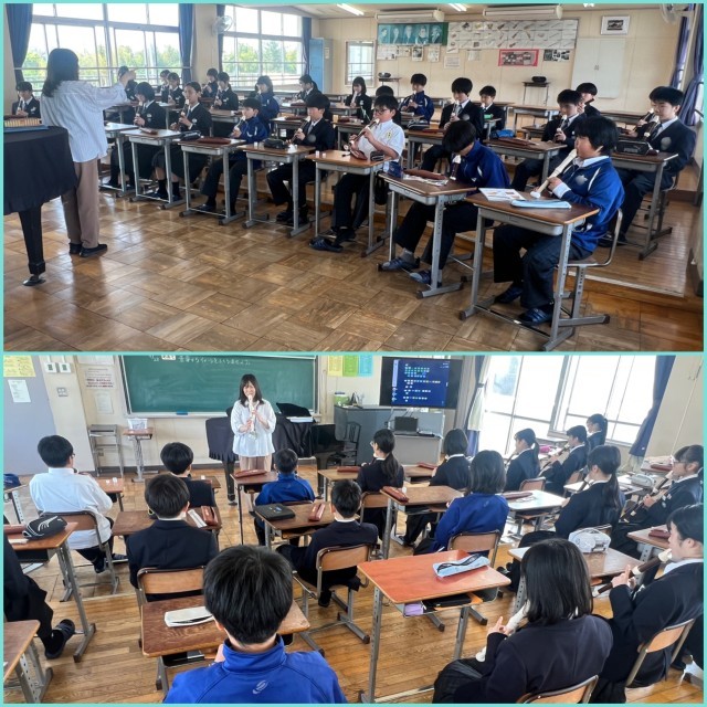 【4/28 リズムに合わせて…】 公開日 2026/04/28 更新日 2026/04/28 1年生 1年生の音楽科の授業。アルトリコーダで音を出す練習をしています。担当教員が手本を示した後に、生徒が演奏します。タンギングを意識して音を出します。担当教員がリズムを変えて、だんだん難しくなっていきます。それでも、生徒はリズムに合わせて正確に演奏しています。よくできました。