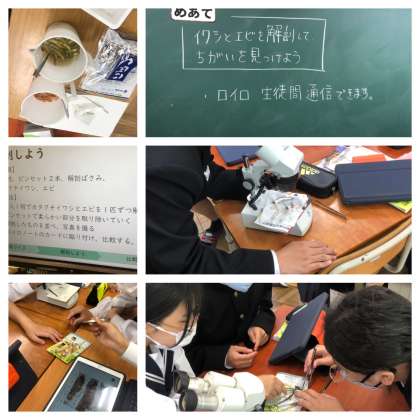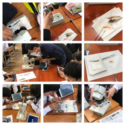 【5/22 イワシとエビの違いは・・】 公開日 2024/05/22 更新日 2024/05/22 1年生 1年生の理科の授業。 イワシとエビの構造の違いを考えていました。 実際に自分たちで、イワシとエビをピンセットで解剖していました。 顕微鏡を使って、細かい部位を見ながら活発な話し合いが行われていました。