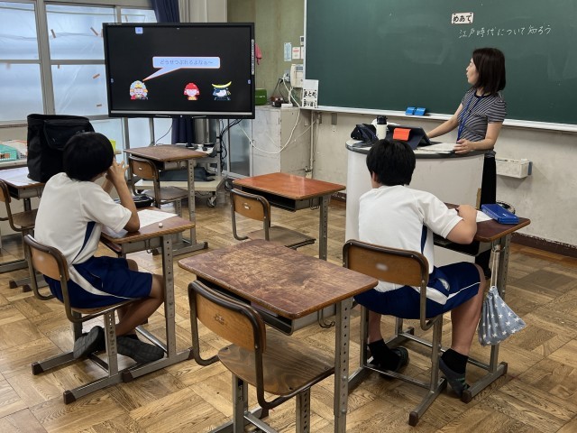 江戸に幕府が開かれた過程を、電子黒板を使って説明します。