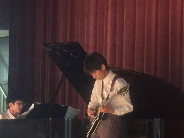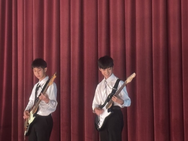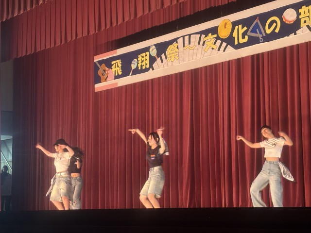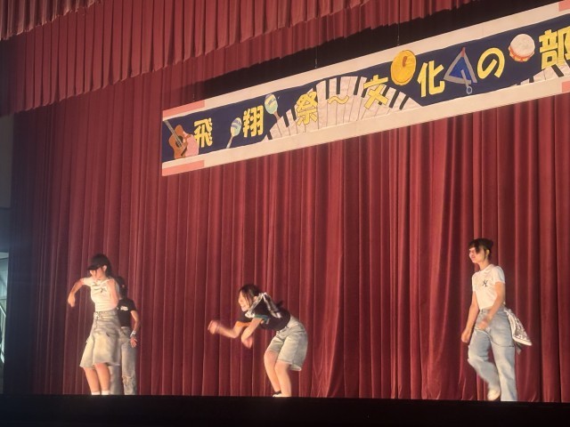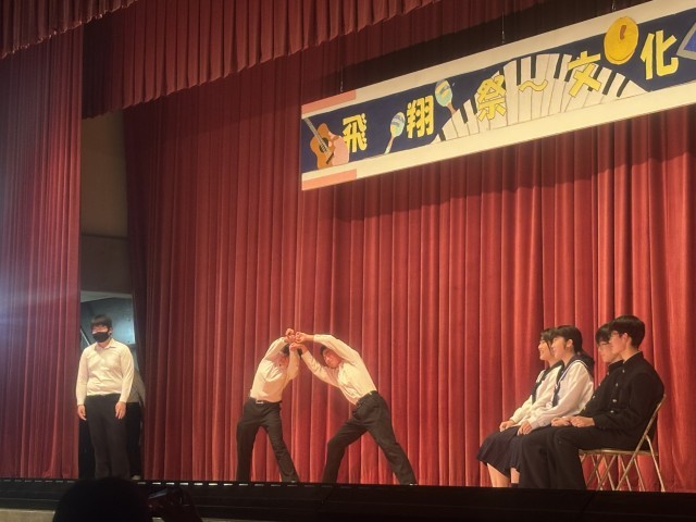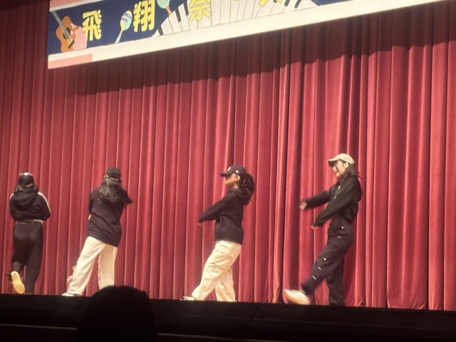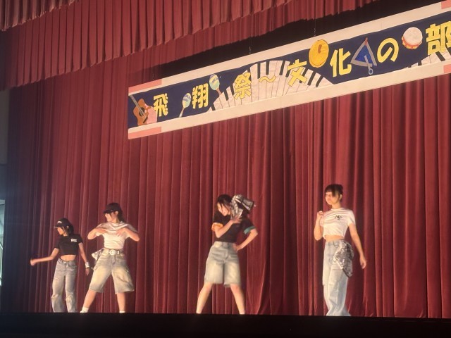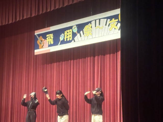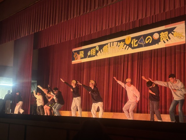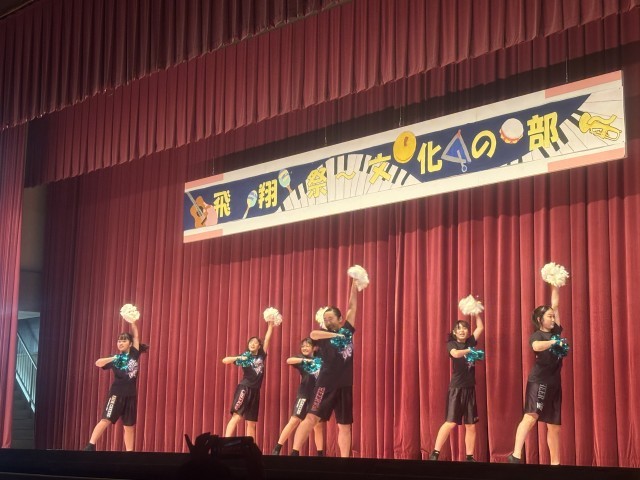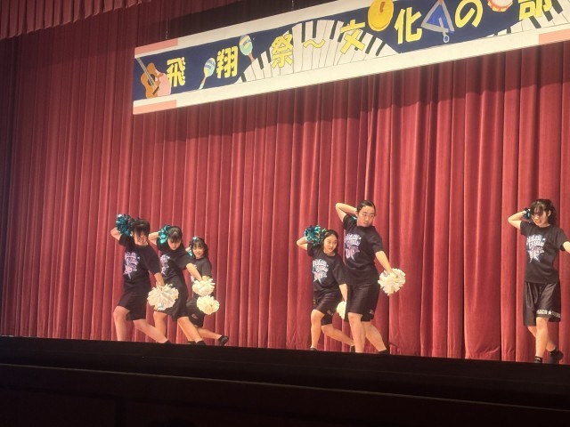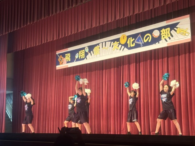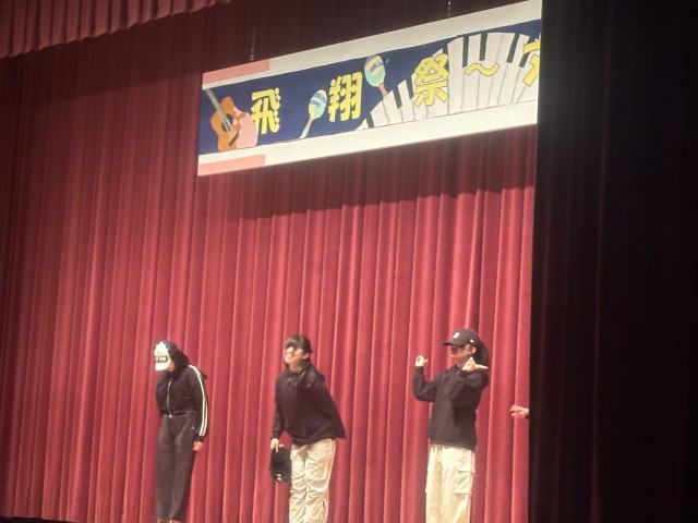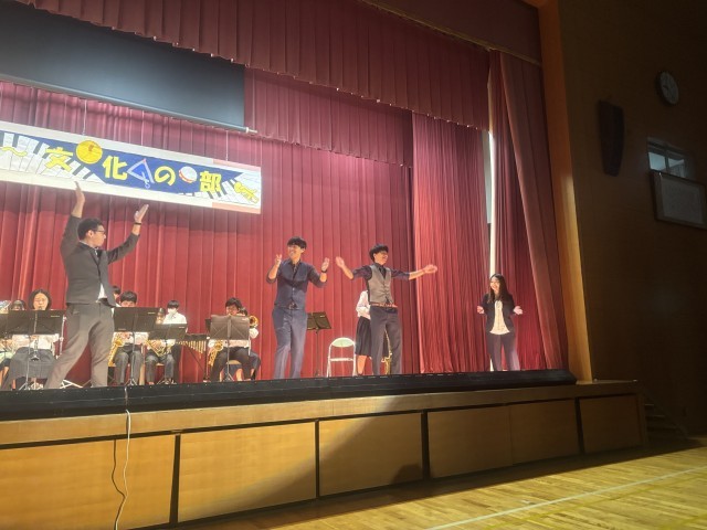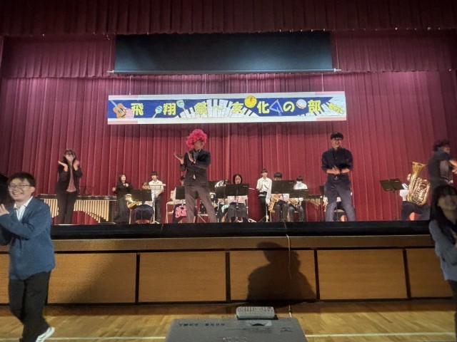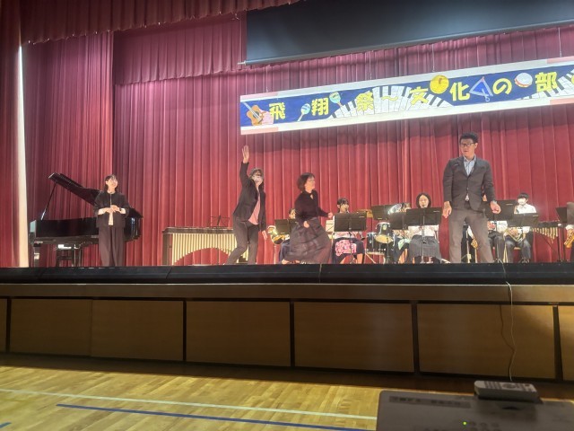 学校の様子 吹奏楽部の演奏に先生たちがダンスで参加します。