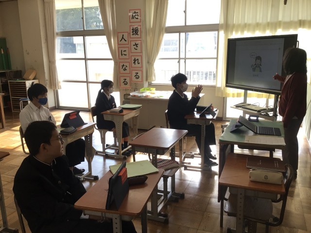 電子黒板に写真が映ると、生徒は素早く答えています。
