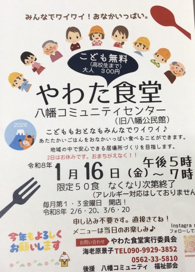 やわた食堂実行委員会から、やわた食堂のお知らせが届きました。 温かいご飯をお腹いっぱい食べることができますよ。 詳細を載せてありますのでよろしくお願いします。