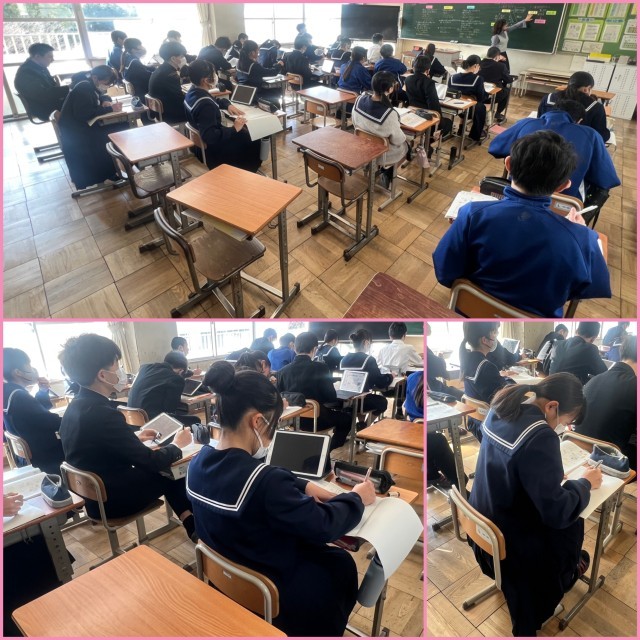 生徒は、教科書や記述したノートを指し示しながら説明しています。